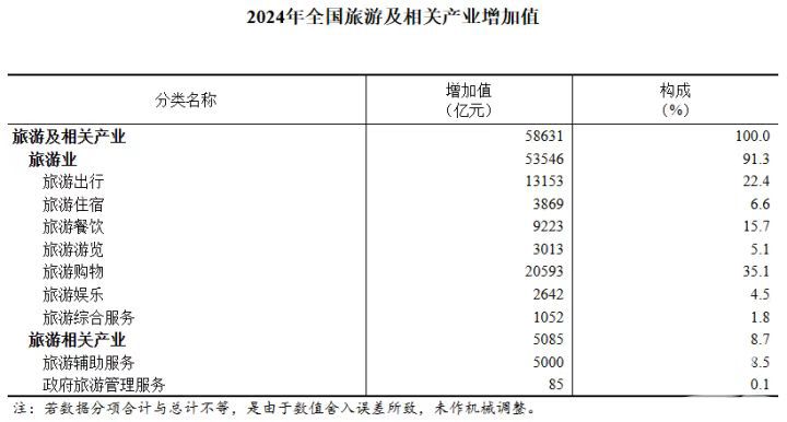 经核算,2024年全国旅游及相关产业增加值为58631亿元,占国内生产总值(GDP)的比重为4.35%,比上年提高0.11个百分点。