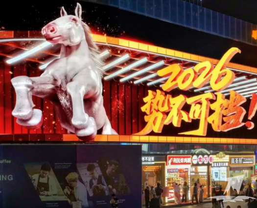 在湖北武汉江汉路步行街,1024平方米的裸眼3D巨幕上,随着零点的钟声响起,红色机械马变为矫健白马,伴随一声穿透夜空的嘶鸣,白马挣脱屏幕奔腾而出,市民游客在欢呼声与拍照快门声中“跨”入2026年。
